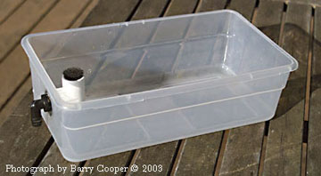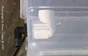 Here are pictures to show how I make flow-through boxes for fry. I use Sterilite brand boxes because they are fairly transparent. Water is dripped in from a distribution system at the opposite end of the box to the elbow, which drains the overflow to the sump.