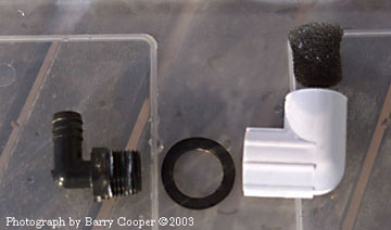The parts:On the left, a 1/2″ thread/barb elbow; in the center, a rubber washer; on the right, an elbow that is threaded on one side and slip-fitting on the other. The slip end takes the sponge plug.