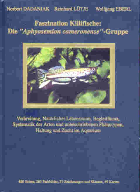 Eberl. W, Dadaniak. N,Lütje. Reinhard 1980 Faszination Killifische: Die Aphyosemion cameronense Gruppe. A very high qualty publication on top quality paper which highlights the vast amount of colour photograph's. This is the Bible of this group of Killies. Written in German totally but their is a manuscript available in English which faithfully follows each page with gaps for each photo/illustration. |