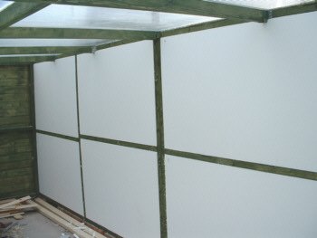 View of finished corner section. Polystyrene is held in place with galvanised nails through zinc washers. The stands will be against the walls & will hold it all together. |