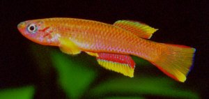 The golden yellow colouration is nore brighter in wild caught fish. Tank raised fish do not seem as bright although the colour is retained in the un-paired fins. Sides of aquarium raised fish have a purple/blue colouration. Under good conditions the body has a brown/yellow sheen. This sp. seems particularly susceptible to velvet so the tank must be kept clean & clear of un-eaten food left to decay. Regular water changes are required. |