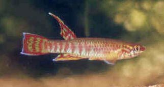 In 1966 Scheel collected them in wooded areas of the inland plateau of eastern Cameroon. In the 1960's Dr.Benigno Roman of Madrid received collections from Equatorial Guinea. Results of his studies were published in'Los Peces de Rio Muni'. Barcelona. 1971. p165. Mention is made in the book of a location 'Cuenca del Miyogo, afl Monyoga el 10/8/1966'. This means an area of Miyogo in a stream/water course of the Monyoga drainage. Known to be in the BKA in December 1966. These were sent by Leif Christensen of Denmark & were breeding at one & a half inches. They were described as having a 'yellow body with a pattern of reds & browns'. Also came into the UK through the BKA Species Import Committee late 1968 & June 1974. Collected by Roger Langdon north of Sangmelima (Cameroon) in 1971. Scheel collected at Lolodorf in 1974. Rod Roberts along with 7 Austrians & a Frenchman collected in Cameroon in July 1983 (K/N 228). Rod's group also comprised Ed Pürzl & Hubert Peturka. A population was caught at Febmimbang. This population was distributed in the UK in limited numbers. In January 1986 P.Wagner & R.Wendel found this species in Gabon for the first time. History of the synonymous A.jacobi. Jacob, in 1928, collected 4 specimens from the Lokundje River, Lolodorf, southern Cameroon. This locality is 440 metres above sea level. These were examined by Ahl & used to name the species Panchax jacobi. History of the synonymous A.jaundensis. Ahl described Panchax jaundensis in 1924 from a single female collected at Jaunde, east Cameroon. Holly studied the type material in 1930 & changed some of Ahl's data. History of the synonymous Panchax loboanus. Ahl, in 1924, used a single specimen collected by Schreiner at the upper reaches of the Lobo River, Sangmelima, southern Cameroon. In 1930 Holly re-examined the type specimen & changed some of the meristic data given by Ahl. History of the synonymous Panchax loloensis. Jacobs caught 4 specimens at Lolodorf, eastern Cameroon which Ahl used in 1928 to describe the species. Lolodork can be found on the Lokundje River north of Kribi & south of the Nyong River. Lolodorf is 440 metres above sea level. | ||||||||||||||||||||||||||||
