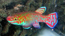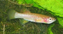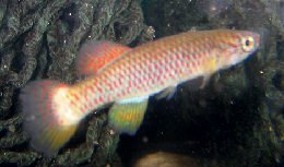 A stocky fish. Males have heavy red lines on the head. The body shows spots in the front half & vertical lines in the rear half which vary in intensity between populations. | ||||||||||||||||||||||||||||||
