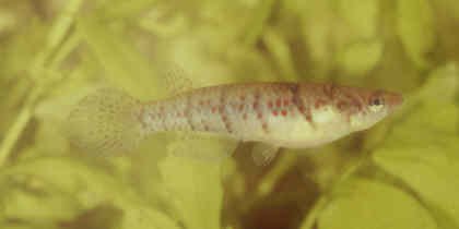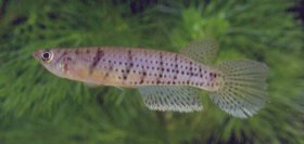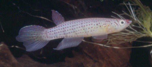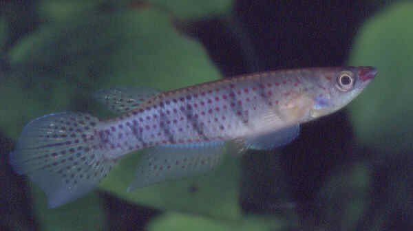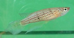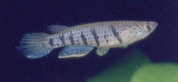 Distinguishing this species from sexfasciatus can be done by the eyes which are glass green whereas sexfasciatus are not. Preserved fish can also be seperated by the lateral line organs on the dorsal part of the snout which resemple Roloffia type in grahami & Aphyosemion in sexfasciatus. This is a 'spotty' fish much the same as E.singa from the Zaire River drainage. E.grahami can be seperated by there vertical dark bands & 'shiny green' eyes. |