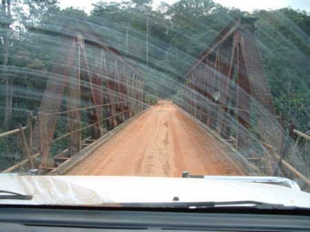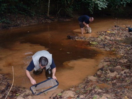 Two photos taken on the BLLMC 05 trip. Left hand photo shows bottom sandy layer being stirred up during collection. The right hand photo is the bridge over the river at Akwen. Photos courtesy of Christine Lambert ,Melin J-Y & M Bogaert. The biotope of this population is a sand base. I set up a breeding tank with a silver sand base but only got 6 eggs from it. Most eggs being deposited on sunken mops. |