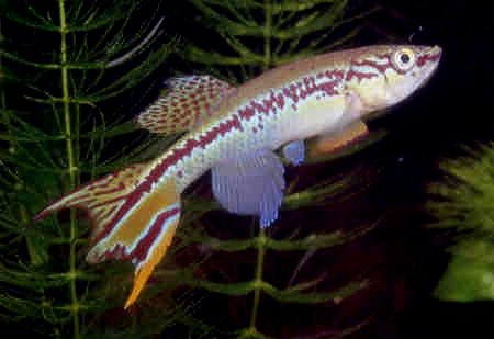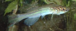 Odieke - Orashi River, southern Nigeria. Collected by Uyi & Otufu in 1991. Rumuokwuta - Near Port Harcourt. Collected by Powell in 1980. Yellow gularis - Described by Arnold in 1934. A broad median line extending into the caudal fin. Irregularly spotted rounded dorsal fin. Anal fin rounded with irregularly spotted with a broad red submargin. Caudal trilobate with bands of contrasting colours. Pectoral fins pointed.